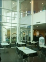 Indenfor hovedindgangen er det muligt at skabe sig et overblik over husets indhold, som kan virke overvældende med de forskellige niveauer, der skyder sig ind over hinanden. Cafeen serveres også morgenmad for hotellets gæster.