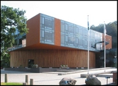 Det kubiske auditorie hviler på en træbeklædt cylinder.