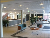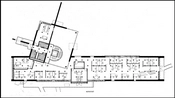 Den ekspressive bygning er opført på en skrånende grund. Såvel brandtrapper som understøtning af udkragede bygningsdele står stærkt expressivt.