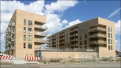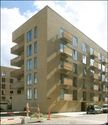 Bygningerne er beklædt med tegl med klart aftegnede vinduesåbninger og indskæringer til de halvt tilbagetrukne altaner.