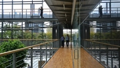 Gangbroerne og gelænderne er belagt med massiv eg. Det bringer en smule varme ind i det meget stringente farvemiljø.