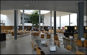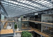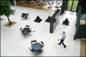 Hovedatrium med informelle mødesteder. Gulvbelægningen i stueplan er en naturhvid vratsa sandsten. Den kaster blødt daglyset fra oven rundt i bygningens strøg, og spiller klassisk flot sammen med den sorte granit.