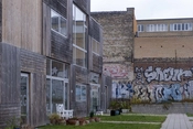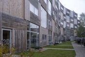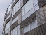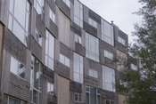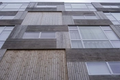 Facadermes træbeklædning fremstår med stor omhu for samlingerne, og i en gennemarbejdet komposition. Altanværne er bygget af metalgitter, som man normalt bruger som hegn rundt om byggepladser, og lofterne i lejlighederne fremstår i rå beton.