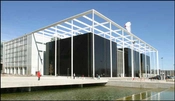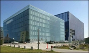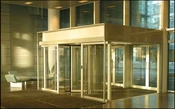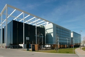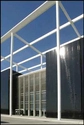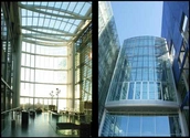 Bygningen er beskyttet af en ydre glasskærm bestående af skråtstillede åbne glaslameller.