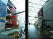 Eskalatoren tæt ved hovedindgangen fører fra foyerens nederst niveau op til studie 1 og 2, således at publikum ledes den rette vej.