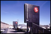 Fra fodgængerbroen mellem Fisketorvet og Vesterbro markerer S-togsstationen sig med sorte, delvis transparente elevatortårne og S-banens logo.