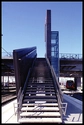 Trapperne mellem perron og gangbro fremstår åbne stålkonstruktioner med hulplader både som trin og rækværker.
