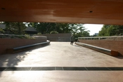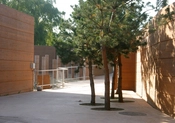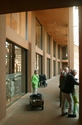 Publikum, som står i halvmørke på en rampe, er indrammet af en smukt indfarvet beton i rødbrunt pigment. Rampen fortsætter som en spiral inde i huset mellem de to indre gårdrum.