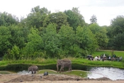 Den smalle bræmme vand er bred og dyb nok til at elefanterne kan svømme, og så stejl ind imod Frederiksberg Have, at elefanterne ikke kan kravle op den vej. Udearealet er tegnet af Stig L. Andersen.