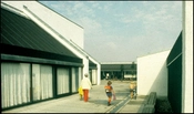 Indtryk af det vinklede uderum mellem kirke og sekundære bygninger.