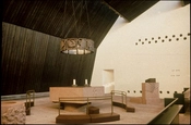 De skrå loftsflader er akustisk begrundede, mens korets rodede elementformer virker mindre indlysende.