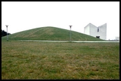 Enghøj kirke er usædvanlig ved i stedet for sadeltag at have et nedadvendt tag, der ender i en skotrende. I forhold til landskabet spiller den hvide bygning sammen med en nærliggende høj. Udefra dominerer den tilknappede kirkekrop med det omvendte sadeltag over områdets sekundære anlæg som klokkeophængningen bag en murudsparring i en lavere fløj. Klokkeophængningen er sket i en lav galge ved en udsparring i en sekundær mur og opstillingen er beskyttet af et smalt tag.