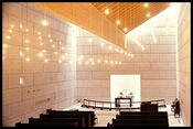 I kirkerummets vestgavl er orgelpiperne anbragt gruppevis, så de understreger kirkeloftets nedadgående sadeltagsform.