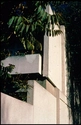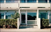 Facadeparti med trin og betonflanger ved indgangens sider.
