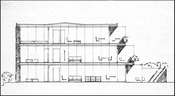 For hver etage trækkes vestfacaden et fag længere tilbage end den underliggende, hvorved terrasseringen tydeligt betones.