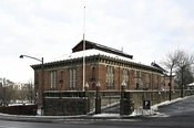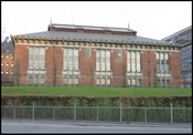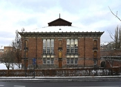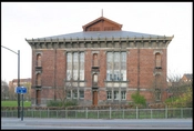 Bygningens hovedindgang markeres ved en sandstensportal.