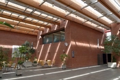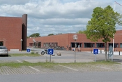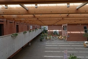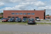 Bebyggelsen er præget af minimalistiske volumener i rødt tegl. I den centrale hal komplimenteres det røde tegl af omsorgsfuldt detaljerede betonelementer og det karakteristiske lysindfald mellem tagets limtræsbjælker. Huset er opført i 1972-73.