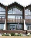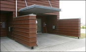 Facaderne er beklædt med en vandret bræddebeklædning af nordisk gran, og har fremstående profiler med drypnæser for hvert andet bræt.