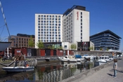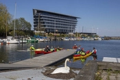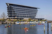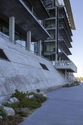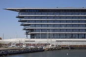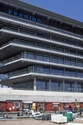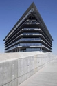 Bygningen ligger på en stor plint, der fungerer som stormflodsbarriere. Den trekantede geometri giver plads til et stor atrium med ovenlys i bygningens centrum. Landskabsarkitekturen integrerer robuste gademøbler og et blødt landskab mod den tunge beton og havklimaet. Den lette glasbygning i mørkt glas går i dialog med den tunge med lyse betonsokkel.