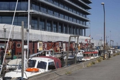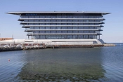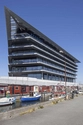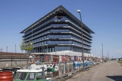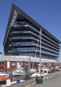 Bygningen står i stærk kontrast til det omgivende havnemiljø med bygninger i lille skala.