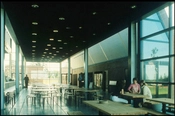 Ved køkkenet er der cafeteriadisk til udlevering af mad og drikke - stedets butik. Gulv af store betonfliser.