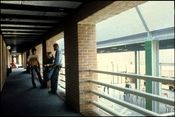 Den brolagte gade fortsætter ind igennem hovedindgangen og tværs gennem gymnasiet. Bygningen er opført med bærende mure af rød tegl.