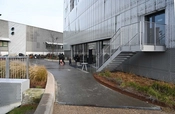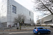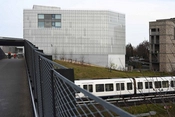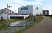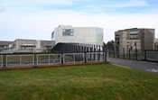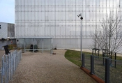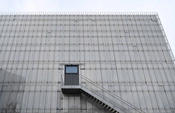 Selve bygningen er femkantet og af dens seks etager er de to underjordiske, begravet under bakkens bløde side. Facaden glinser heller ikke af rislende vand, men dens beklædning får det til at se sådan ud.