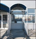 Hovedindgangen er markeret af to søjler og en udkraget baldakin.