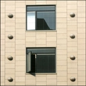 Facaden er beklædt med lyse klinker og ornamenteret med halvkugleformede armaturer.