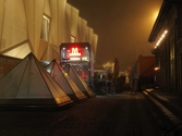 De lange og lukkede facadearealer langs centrets syd og nord facade fremstår levende og bevægede som en stor telt-konstruktion. Membranen er semitransparent, så der opstår et visuelt spil mellem den lyse bagvæg. Ved at etablere en lyssætning mellem klimaskal og yderste lag indklædning, fremhæves en urban, pladsmæssig oplevelse af området syd for centret.