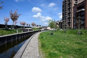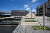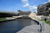 Der er anlagt små haver med hjemmehørende vækster centralt i små plateauer, der skalerer uderummene ned, og giver siddepladser til forbipasserende. Opholdsarealerne trapper ned i en række spejlvandsbassiner, der flyder over i en langstrakt sø, der skaber attraktionsværdi og et centralt mødested for børn og voksne. Søen fortsætter som en langstrakt kanal, der med tiden, når den bliver udbygget og forlænget, kan bruges til kajaksport.