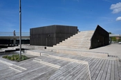Langs broen, og med udsigt til den nye bebyggelse ved Herredsvejen, ligger der opholdsarealer, der terrasserende følger broens stigning. Opholdsarealernes flader er lukket af lodrette lameller udført i Thermo Fyr, håndlister i Mahogni og gulvbelægning i planker af Garapa – en eksotisk træsort. Fælles for de tre træsorter er at de patinerer til et karakterfuldt, sølvfarvet skær.