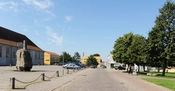 Der er indgang til biblioteket ad en portlignende mellembygning.
