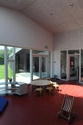 Fællesrum i sydfløjen med to samtalerum, rundt stillerum og køkkenø.