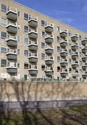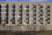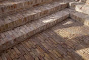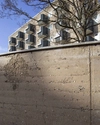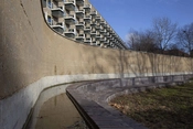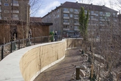 Gårdhavens to niveauer er adskilt af en stampet jordmur (pisé mur), for at minimere brugen af beton. Den slyngede jordmur danner lommer til ophold, leg, dyrkning og regnvandshåndtering.