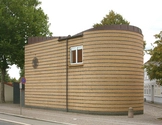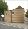 Den smukt mønstrede hjørneafrunding danner en bymæssig fin overgang mellem Carl Nielsens Kvarter og Hans Jensen Stræde.