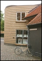 Indgangen til værkstedet er markeret med en intensiveret murdekoration. Til højre ses det oprindelige hus.