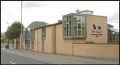 Bygningen er udstyret med store vandspyere hvis inspiration har været historien om hundene med øjne så store som thekopper.
