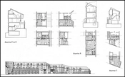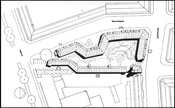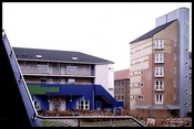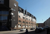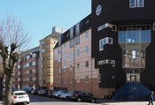 Mod de tilstødende gader varierer boligbebyggelsen fra 2½ til 4½ etage og genanvender i sin struktur den tidligere Hertz skofabrik og en direktørbolig.
