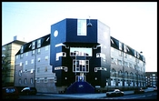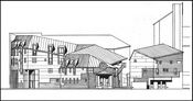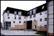 Mod gaden bugter bebyggelsen sig ud og ind - og danner nye byrum. Samtidig bevæger facadeopdelingen sig i vertikale forskydninger mens det skrånende paptag søger at fastlåse bevægelserne.