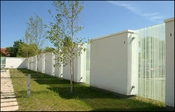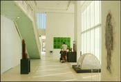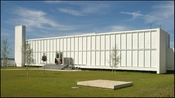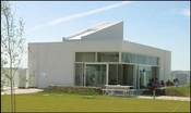 Bygningen opleves som lukket, men den hvide vægflade skyldes rullegardiner, motiveret af ønsket om et diffust lys i de bagvedliggende udstillingssale.