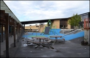 Indskolingens gård. Fleksrum, trapper og garderober vender indad mod gårdsiden, mens hjemklasser, musikrum natur- og teknikrum vender udad.