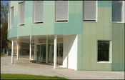 Facadebeklædningen er af genbrugeligt kompositmateriale af 80 % glas.