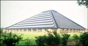 Den formelle, lettere skæve tagform har mindelser om aztekiske pyramider.