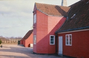 De murede piller der flankerer indgangen fra syd er sammen med de blå dørpaneler og og murværkets horisontale strukturering typiske for nyklassicismen omkring 1.verdenskrig.