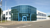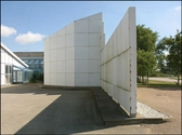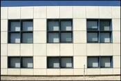 Facaderne er beklædt med kvadratiske, hvide stålplader og har vinduer i samme modul, og facaden fortsætter som regulære skærme, der dækker de bagvedliggende, ældre produktionsbygninger.