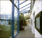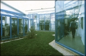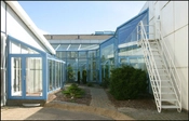 Et haverum og glasgange forbinder og adskiller kontorer og fabriksareal.