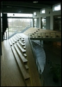 Det markante trappeanlæg sammenbinder de interne funktioner men giver desuden publikum uhindret adgang til biblioteket ved andre arrengementer.