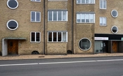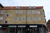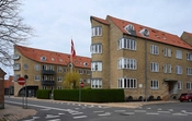 Bebyggelsens vestlige fløj domineres mod gaden af udpræget funktionalistiske karnapper hvorimod tagformen på hovedhuset er afvalmet som regionalt byggeri.