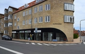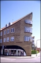 Under den vestlige sydgavl gemmer sig en butik i en udskæring der kan minde om vand der kløves af en skibsstævn.